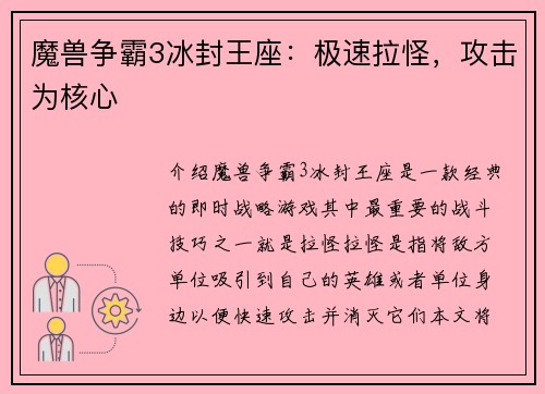 如何把魔兽小地图移动到主地图 1. 介绍 魔兽世界是一款备受欢迎的多人在线角色扮演游戏,拥有庞大的游戏世界。在游戏中,玩家可以探索各种地图,包括小地图和主地图。小地图通常用于显示当前位置和周围环境,而主地图则提供了更大范围的视野。本文将介绍如何将魔兽小地图移动到主地图,以便更好地了解游戏世界。...